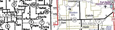 K-39 begins seven miles (11 km) north of Fredonia at U.S. Highway 400 (US-400). It travels east to Benedict, where it turns north toward Buffalo. South of town, K-39 meets US-75 and begins a short, one-mile-long (1.6 km) concurrency with the U.S. Highway. Once leaving US-75, the highway again travels east toward Chanute, where it intersects US-169. The highway continues east 12 miles (19 km) before beginning a seven-mile-long (11 km) concurrency with US-59. After briefly turning north with US-59, K-39 resumes its easterly route north of Stark. The highway shares a very short overlap with K-3 (less than one mile, 1.6 kilometers) and passes through Hiattville before meeting its eastern terminus at K-7, which completes the connection to US-69.[2]