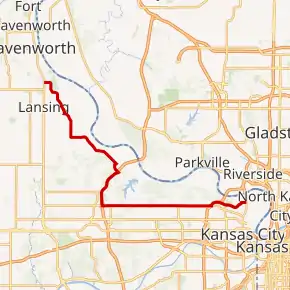 | Wyandotte | Kansas City | 0.000 | 0.000 | Southern terminus; continues east as Sunshine Road | ||