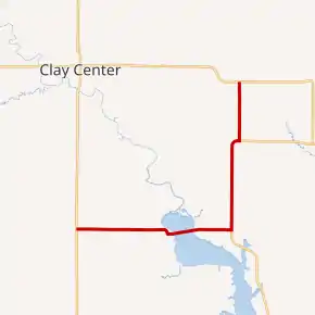 K-82 begins at K-15 south of Clay Center and west of Wakefield in southern Clay County. The highway heads east and crosses Cane Creek on its way to the city of Wakefield, south of which lie the Auld Stone Bard and the Kansas Landscape Arboretum. K-82 enters the city on 10th Street, curves south on Elm Street, and leaves the city along 6th Street. The highway crosses Milford Lake on a bridge and causeway near the lake's north end. K-82 passes a U.S. Army Corps of Engineers park area, one of several along the lake, before the highway leaves Clay County and enters the Fort Riley reservation. The highway follows the Riley–Geary county line—Geary County to the south and Riley County to the north—east 1.5 miles (2.4 km) to US-77, which the highway joins heading north. After the two highways curve east on the northern edge of the military base reservation near the unincorporated community of Bala, K-82 turns north while US-77 continues east toward Riley. K-82 crosses Timber Creek before reaching its northern terminus at US-24 west of Leonardville.[3]