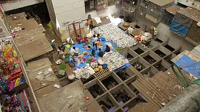 A new concrete 3-story structure was erected in the 1990s between the two older buildings to provide more space for vendors and better overall conditions. At the basement is an underground parking above which stand three commodity-specialised floors: flowers and vegetables on the lower ground floor, dry goods on the upper ground floor and tools and machine-tools accessories on the first floor.[3]