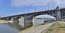 One of the last bridges completed by K. Rudzki i S-ka before the war was the Legions of Marshal Józef Piłsudski Bridge across Vistula in Płock.[1] The difficult construction of the then-longest bridge in Poland was completed in under two years by K. Rudzki i S-ka and another company, Przedsiębiorstwo Robót Inżynieryjnych Leszek Muszyński.[24] The bridge was opened for traffic in late 1938 and demolished only a year later, during the opening stages of the Invasion of Poland.[24]