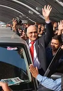 Khadga Prasad Sharma Oli (Nepali: खड्गप्रसाद शर्मा ओली, pronounced [ˈkʰʌɽɡʌprʌsad̪ ˈoli]; born 22 February 1952) is a Nepalese politician and former Prime Minister of Nepal. He served three terms as prime minister from 11 October 2015 to 3 August 2016,[4][5][6] from 15 February 2018 to 13 May 2021 as the first elected prime minister under the new constitution, and from 13 May 2021 to 13 July 2021.[7][8][9]