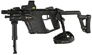 The KRISS Vector[4] is a series of weapons based upon the parent submachine gun design developed by the American company KRISS USA, formerly Transformational Defense Industries (TDI). They use an unconventional delayed blowback system combined with in-line design to reduce perceived recoil and muzzle climb.
