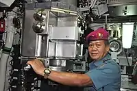 Nanggala underwent a refit at Howaldtswerke that was completed in 1989.[25] Roughly two decades later, the boat underwent a full refit for two years in South Korea by Daewoo Shipbuilding & Marine Engineering (DSME) that was completed in January 2012.[26][2][lower-alpha 1] The refit cost US$63.7 million,[28] replaced much of the submarine's upper structure, and upgraded its weaponry, sonar, radar, combat control and propulsion systems.[29][2] After the refit, Nanggala became capable of firing four torpedoes simultaneously at four different targets and launching anti-ship missiles such as Exocet or Harpoon. Its safe diving depth was increased to 257 metres (843 ft), and its top speed was increased from 21.5 knots (39.8 km/h) to 25 knots (46 km/h).[2] In November 2016, the submarine was equipped with an ASELSAN KULAÇ echosounder system.[30]