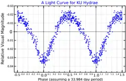 KU Hydrae is a binary star in the constellation Hydra. The primary star is an Alpha2 Canum Venaticorum variable with its apparent magnitude varying from 0.05 magnitudes over a period of 33.97 days.[7]