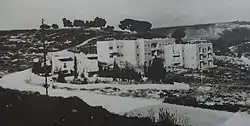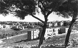 Kadima House, view from Givat Shmuel, c. 1950. In the background is Rehavia. To the left is the "pillbox" at the corner of Gaza and Tchernichovsky.
