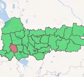 Kaduysky District (Russian: Ка́дуйский райо́н) is an administrative[1] and municipal[8] district (raion), one of the twenty-six in Vologda Oblast, Russia. It is located in the west of the oblast and borders with Belozersky District in the north, Cherepovetsky District in the east and in the south, Ustyuzhensky District in the southwest, and with Babayevsky District in the west. The area of the district is 3,300 square kilometers (1,300 sq mi).[4] Its administrative center is the urban locality (a work settlement) of Kaduy.[3] Population: 17,109 (2010 Census);[5] 18,653 (2002 Census);[10] 19,988 (1989 Census).[11] The population of Kaduy accounts for 66.0% of the district's total population.[5]