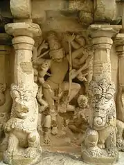 The carving of Shiva on the north facing wall is a composition of Tripurantaka flanked by three ganas, goddess Durga with three ganas, and goddesses Bhairavi, Kaushiki and Jyestha.