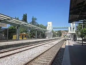 In 2001 the infrastructure element of OSE was created, known as GAIAOSE, it would henceforth be responsible for the maintenance, of stations, bridges and other elements of the network, as well as the leasing and the sale of railway assists.[8] mIn 2005, TrainOSE was created as a brand within OSE to concentrate on rail services and passenger interface. In 2009, with the Greek debt crisis unfolding OSE's Management was forced to reduce services across the network. Timetables were cut back and routes closed, as the government-run entity attempted to reduce overheads. In 2015 a 15-year-old child was airlifted to hospital after being electrocuted at the station.[9] In 2017 OSE's passenger transport sector was privatised as TrainOSE, currently, a wholly-owned subsidiary of Ferrovie dello Stato Italiane[10] infrastructure, including stations, remained under the control of OSE.