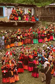 The term is used to refer to many distinct people including the Väi, the Čima-nišei, the Vântä, plus the Ashkun- and Tregami-speakers.[10] The Kalash are considered to be an indigenous people of Asia, with their ancestors migrating to Chitral valley from another location possibly further south,[9][14] which the Kalash call "Tsiyam" in their folk songs and epics.[15] Some of the Kalash traditions consider the various Kalash people to have been migrants or refugees.[16] They are also considered by some to have been descendants of Gandhari people.[17]