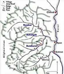 The Kalasha Valleys (Kalasha-mondr: Kaĺaśa Desh; Urdu: وادی کیلاش) are valleys in Chitral District in northern Pakistan. The valleys are surrounded by the Hindu Kush mountain range. The inhabitants of the valley are the Kalash people, who have a unique culture, language and follow a form of ancient Hinduism.[1] As such, the Kalasha Valleys are a source of attraction for Pakistanis as well as International tourists. There are three main valleys.[2][3][4] The largest and most populous valley is Bumburet (Mumuret), reached by a road from Ayun in the Kunar Valley. Rumbur is a side valley north of Bumburet. The third valley, Biriu (Birir), is a side valley of the Kunar Valley south of Bumburet.