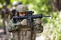 The KCR 556 is a service rifle which was developed for the Turkish Armed Forces by Kale Kalıp It fires 5.56x45 mm NATO ammunition. The modular gun is an advanced gas-operated rifle with rotating bolt head & piston op-rod driven fixed gas system. It is suitable for ambidextrous use. It has a maintenance free gas system up to 10,000 rounds which minimises fouling and heat. The chromeplated cold hammer forged barrel is free floating. The gun is quite ergonomic with its modular flipup iron sight and 5-position telescopic adjustable stock. The gun’s length is 655 mm when the stock is extended. The barrel length is 190 mm. The gun weighs 2,630 grams excluding the magazine.[1][2]