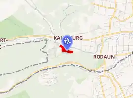The College is located to the south of Kalksburg on the edge of the Vienna Woods. The long main building can be reached via a bridge over the Liesingbach.[6] It consists of the four-storey school and the rectory and fathers' tract, to the west in the form of an honorary court. The main building has several chapels. The Marian Congregation Chapel and the Rectory Chapel were built between 1895 and 1897, largely during this period of construction. A Maria Immaculata painting by Leopold Kupelwieser was installed on the altarpiece at the altar retable, and the windows above the arcades were made by the Tyrolean Glass Painting and Mosaic Institute. The convent chapel contains the travel tale of Napoléon Bonaparte. The collegiate chapel on the back of the rectory and father's yard shows a fresco by Bengt Olof Kälde from 1986. The former Guardian Angel Chapel is a simple room dating back to 1900.[7]