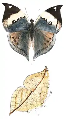 Males and females upperside blue. Forewing with a broad pure while obliquely-placed discal sinuous band, its inner margin defined in black along the discocellulars and base of interspace 3, with a round black hyaline (glass-like)-centred spot in interspace 2; the width of this discal band decreases posteriorly; measured on the costal margin its outer edge is at a distance greater than half the length of the wing from base; apical area beyond discal band black with a preapical white spot, larger in the female than in the male. Hindwing with the costal margin and apex broadly, and the abdominal fold pale earthy brown. Forewings and hindwings with the usual subterminal dark zigzag line. Underside as in Kallima inachus. Antennae black; head, thorax and abdomen dark indigo-blue: beneath, the palpi, thorax and abdomen earthy brown.[1]