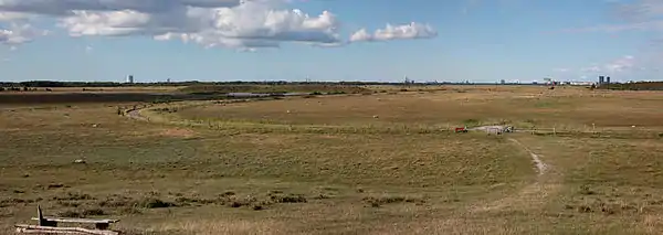 The area consists of reclaimed sea bed, with a number of former islets making up small isolated hills; it was dammed and drained during the 1940s to serve as an artillery training range. After active military use ended in 1983, some of the area has been used for transportation infrastructure (motorway and railway in connection with the Øresund bridge), a landfill on the strip between the motorway and the ocean dyke, a golf course and the southern end of the Ørestad urban development. Most of the area, however, lies as lightly maintained parkland featuring a range of nature types, from young forests to tidal marshes; some areas are prevented from developing into forests by grazing livestock and game. After years of preparation the area was finally cleared of unexploded munitions and fully opened to the general public on October 15, 2010. [1] [2] Previously, because of the risk of unexploded munitions, walking outside the paths and roads was generally not allowed. A large area in the southwestern corner is set aside under the Natura 2000-scheme as an EU-recognized bird protection area to which the general public has no access. [3] [4]