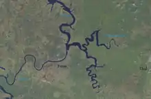 The Kama (Russian: Ка́ма, IPA: [ˈkamə]; Tatar: Чулман/Çulman; Udmurt: Кам) is a 1,805 kilometres (1,122 mi) long[1][2] river in Russia. It has a drainage basin of 507,000 square kilometres (196,000 sq mi).[2] It is the longest left tributary of the Volga and the largest one in discharge. At their confluence, in fact, the Kama is even larger than the Volga.