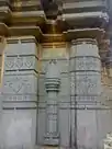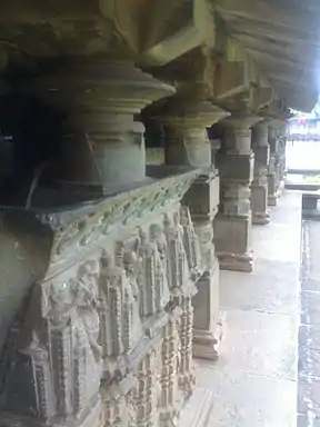 It contains sculptures, including lions and floral motifs. The temple has three cells and hence comes under the classification of Trikutachal temples.[2] There are three shrines here. The first shrine has a statue of Narayana. The second has a statue of Lakshmi Narayana, with the Goddess Lakshmi seated on the lap. The third shrine has a statue of queen Kamala Devi, with her attendants on either sides.[4] The interior roof of the temple has an exquisitely carved gigantic lotus in an inverted form. The temple roof stands on colonnade of pillars with rich carvings. Pillars with roaring lions between them pyramidal towers surrounding these pillars and having girls in poses between them and beautiful scroll work on top. The stone panels along the facade of the temple have emblems of the Kadamba dynasty and other figures.[2]