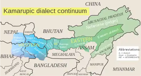- "Eastern Magadhi Prakrit has been divided into four dialect groups by scholars like Dr Chatterji. Kamarupa dialect comprising Assamese and the dialects of North Bengal is one of them. So it becomes necessary to see how much Kamrupi is related to North Bengali" (Goswami 1970, p. 177)