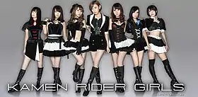 Kamen Rider Girls (仮面ライダーGIRLS, Kamen Raidā Gāruzu) are an idol group developed by Avex Trax and Ishimori Productions to commemorate the Kamen Rider Series' 40th anniversary in 2011.[1] Each of the group's current members represent one of the protagonists of the Kamen Rider Series.[2] The group made their premiere at an event featuring members of Columbia Music Entertainment's Project.R group, the musical collaboration who provides music for the Super Sentai series.[3] The group's debut songs were "Koi no Rider Kick" (恋のライダーキック, Koi no Raidā Kikku, "Love's Rider Kick") and "Heart no Henshin Belt" (♡(ハート)の変身ベルト, Hāto no Henshin Beruto, "The Heart's Transformation Belt").[2] The group's debut songs were played on the DJ HURRY KENN Ride the Groove Internet radio program, the successor to the Wind Wave radio programs from the Kamen Rider W series. The group's debut single is "Let's Go RiderKick 2011", serving as the theme song for OOO, Den-O, All Riders: Let's Go Kamen Riders with "Koi no Rider Kick" and "Heart no Henshin Belt" as the single's B-sides. A second single titled "KAMEN RIDER V3" was released on August 3, 2011 with the PV having a cameo by Hiroshi Tanahashi.[4]