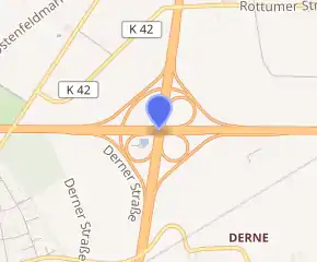The Kamener Kreuz was formerly a full cloverleaf interchange near Dortmund in North Rhine-Westphalia Germany where the Autobahnen A1 and A2 meet. It lies between the towns of Kamen and Bergkamen in the west and the city of Hamm and the municipality Bönen in the east. The Kamener Kreuz, opened in 1937, was the second interchange between two Reichsautobahnen, the first one being the Schkeuditzer Kreuz. It is used by 160,000 vehicles per day.
