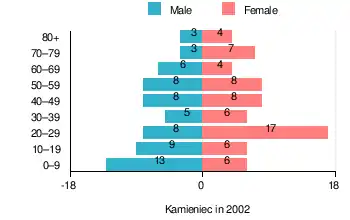 According to the 2002 Poland census, there were 129 people residing in Kamieniec village, of whom 48.8% were male and 51.2% were female. In the village, the population was spread out, with 24% under the age of 18, 35.7% from 18 to 44, 21.7% from 45 to 64, and 18.6% who were 65 years of age or older.[1]