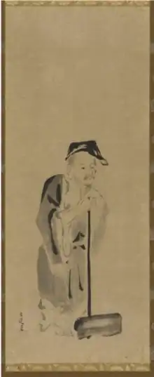 It was the intention of Mitsunobu's brother, Kanō Takanobu, to have his son, Kanō Tan'yū, remain in Kyoto as designated heir to his father's sub-branch of the Kano school workshop.[3] However, Tan'yū accepted the title of goyō eshi in 1617 and began to plan his atelier in Edo, most likely with the Tokugawa shōgun's approval. This moved Tan'yū's younger brother, Kanō Naonobu, up as to succeed the family workshop in Kyoto upon Takanobu's death. However, in 1630 the city of Edo was flourishing and Naonobu was also made goyō eshi and given his own parcel of land at Takegawachō in Edo, where he then built his residence and studio.[3] The main Kanō-school workshop, led by Sandanobu by this time, remained in Kyoto, either by instruction of the shōgun or Sandanbou's own will. However, he had no brothers or children he could designate as heir by the time of his passing in 1623.[1][2]
