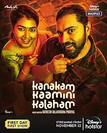 Kanakam Kaamini Kalaham is a 2021 Indian Malayalam language experimental satire film written and directed by Ratheesh Balakrishnan Poduval.[1] The film stars Nivin Pauly, Grace Antony, Vinay Forrt in important roles and Sudheesh, Jaffar Idukki, Joy Mathew, Vincy Aloshious, Sivadasan Kannur, Rajesh Madhavan in supporting roles. The film is produced by actor Nivin Pauly under the banner of Pauly Jr. Pictures. The movie was released directly through Disney+ Hotstar on 12 November 2021.[2][3][4].The movie enhances with different presentation, making, colour tone and absurd-comedies, but it is not well accepted by the audience.