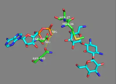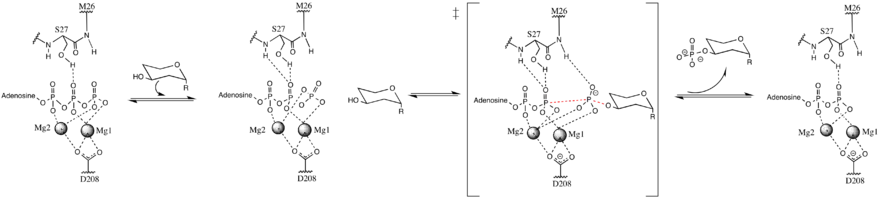 While earlier studies of APH(3') supported a mechanism involving the nucleophilic attack of γ-phosphate by the 3'-hydroxyl, more recent studies suggest that APH(3’) catalyzes the transfer of the γ-phosphate from ATP to an aminoglycoside through a dissociative mechanism, where deprotonation of the substrate is not critical to phosphate transfer, but instead the stabilization of a metaphosphate transition state.[8][12] Additionally, APH(3’) has a nucleotide positioning loop (NPL) that closes down on the enzyme active site after binding ATP, facilitating the phosphorylation of the 3’-hydroxyl group. Key to correctly positioning the phosphate group are Ser27 and Met26 residues. Initially, two magnesium ions stabilized by Asn195 and Asp208 facilitate the binding of ATP in the active site and orient the ß- and γ-phosphate groups. The NPL then undergoes a conformational change to form a hydrogen bond between Ser27 and the ß-phosphate group. Upon binding of substrate, APH(3') undergoes another conformational change to orient Ser27 such that its amide backbone disrupts the alignment of ß-phosphate and γ-phosphate, weakening the γ-phosphate bond. The amide backbone of Met26 forms a hydrogen bond with the metaphosphate to stabilize the transition state, as a magnesium ion (designated Mg1) then lengthens the γ-phosphate bond, breaking it and effectively phosphorylating the hydroxyl group.[8]