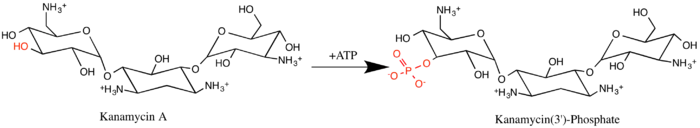Aminoglycoside-3'-phosphotransferase (APH(3')), also known as aminoglycoside kinase, is an enzyme that primarily catalyzes the addition of phosphate from ATP to the 3'-hydroxyl group of a 4,6-disubstituted aminoglycoside, such as kanamycin.[2] However, APH(3') has also been found to phosphorylate at the 5'-hydroxyl group in 4,5-disubstituted aminoglycosides, which lack a 3'-hydroxyl group, and to diphosphorylate hydroxyl groups in aminoglycosides that have both 3'- and 5'-hydroxyl groups.[2][3] Primarily positively charged at biological conditions, aminoglycosides bind to the negatively charged backbone of nucleic acids to disrupt protein synthesis, effectively inhibiting bacterial cell growth.[4] APH(3') mediated phosphorylation of aminoglycosides effectively disrupts their mechanism of action, introducing a phosphate group that reduces their binding affinity due to steric hindrances and unfavorable electrostatic interactions.[5] APH(3') is primarily found in certain species of gram-positive bacteria.[6][7][8]