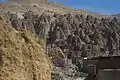 The village exemplifies manmade cliff dwellings which are still inhabited. The troglodyte homes, excavated inside volcanic rocks similar to dwellings in the Turkish region of Cappadocia, are locally called Karaan.[3] Karaans were cut into non-welded ignimbrites, also called "ash-flow tuffs," of Mount Sahand. The cone form of the houses is the result of the erosion of ignimbrite layers consisting of porous, round and angular pumice together with other volcanic particles that were positioned in a grey, acidic matrix. During the eruption of Sahand, pyroclastic flows formed the rocks of Kandovan. Around the village the thickness of this formation exceeds 100 metres (330 ft) and with time, due to water erosion, the cone-shaped cliffs were formed.[4]