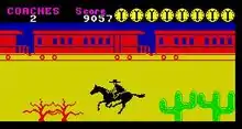 Scene 3: When the player reaches the town, he is ambushed by outlaws. The player controls the aim of a revolver, but unlike the first scene, the character on screen also moves left and right with the aim movement. The outlaws appear from cover at varying positions in the town and shoot at the player. The player must shoot ten outlaws, avoiding being shot himself. At higher difficulty levels, the bandits are quicker and more accurate. The players' revolver has six bullets. At any time the player can move to the rightmost position to reload the weapon, but he is still vulnerable when reloading. The peace tokens are spent if the player is shot.