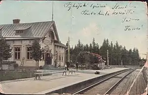 The project of the old Ostrobothnian railway from Tampere to Vaasa via Haapamäki and Seinäjoki was initiated during the end of the 1870s. During the planning stages of the line, a dominant question was whether it should be built around the western or eastern side of lake Näsijärvi. The eastern option was settled on, making it cut through the municipality and parish of Kangasala through its northern side, some 5 kilometres (3.1 mi) away from the parish village. The construction of the railway was initiated in 1879, completed in 1882, and it was opened for traffic in 1883.[2] On the terrority of Kangasala were the villages and stations of Suinula and Siitama, further away from the municipal church to the north, with the former most commonly being used by travellers bound for the surroundings of the church.[3] The Halinmaa halt was opened in 1888 to serve the parish village,[4] being placed about 5 kilometres (3.1 mi) further towards Tampere compared to Suinula.[1] A post office was opened at the halt on 1 June 1895.[3]