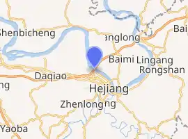 The Kangbo Yangtze River Bridge (Chinese: 康博长江二桥), was called Second Hejiang Bridge, is a highway bridge over the Yangtze River in Hejiang County, Sichuan, China. The bridge is on the G93 Chengdu–Chongqing Ring Expressway just 10 kilometres west of the Bosideng Bridge. It was originally called Hejiang Bridge 2 since Bosideng Bridge was first called Hejiang Bridge 1.[2] The bridge has a length of 1,715 metres (5,627 ft) and is 30 metres (98 ft) wide. Its two pylons are each 208 metres (682 ft) heigh making the bridge to the one with the highest pylons in Sichuan.[1]