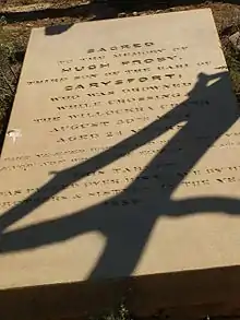 The Flinders Ranges is very dry country, so it is both tragic and ironic that on 30 August 1852, Proby drowned when he was swept from his horse crossing the swollen Willochra Creek while trying to herd a mob of cattle during a thunderstorm.[6] Aged 24, he was buried the following day. Six years later in 1858 his grave was marked with an engraved slab shipped from Britain by his brothers and sisters; it was said to weigh one and a half tons and posed a significant challenge to transport it to the grave site (see photograph below).