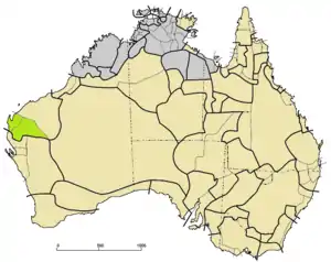![]() Kanyara–Mantharta languages (green) among other Pama–Nyungan (tan). Kanyara is the group on the coast, Mantharta inland. | |