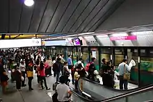 Kaohsiung Metro is made up of the Red Line and Orange Line with 37 stations covering a distance of 42.7 km (26.5 mi).[2] 27 of these stations are underground, with 8 elevated and 2 at-grade level. All underground stations have full height platform screen doors.