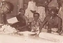 The students and faculty of Kalakshetra (1957). Second row: Rukmini Arundale in the middle, Sankara Menon (to her left), Mysore Vasudevachar and Karaikudi Sambasiva Iyer (to her right). Karaikudi Subramanian is sitting to the far right in the first row