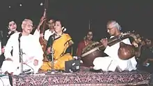 Karaikudi Subramanian has been designated the title "Top-Grade artist" by All India Radio and has performed numerous radio concerts as well as live concerts at various venues around the world.[3][4] He has performed with fellow veena player Ranganayaki Rajagopalan and his sister Rajeswari Padmanabhan, both disciples of Karaikudi Sambasiva Iyer. He has also accompanied artists such as flutist T. Viswanathan and vocalist K. V. Narayanaswamy.[5] Furthermore, he has engaged in cross cultural performances with prominent musicians of other genres such as the Irish fiddler Martin Hayes and the Finnish composer Eero Hämeenniemi.[6]