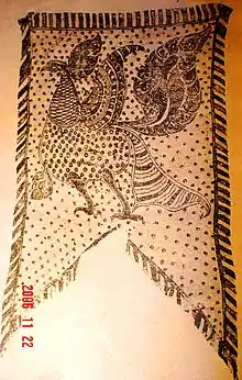 Across the Palk Strait, the kinsmen of the Karavas too have used similar insignia in the past. H. R. Pate describes a wedding as follows: A peculiar feature of the wedding is the procession to the bride's house with virudus or banners supposed to be the insignia of the Kingly ancestors of the race. The emblems consist of 21 flags embroidered with representations of various objects, animate and inanimate, such as a Snake, a Peacock, a Palmyra, a Chank, the Sun and Moon an Elephant. A Fish and so on. In addition to these a large Umbrella, a Shield and other trappings are carried. The bridegroom wears a costume called KAPA resembling the state robes of Jathi Thalavi More and white cloths are spread before hi in his path. (Madras District Gazetteer 123 & 124)