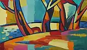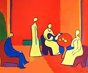 Having sound and deep understanding and perception of the coloristic achievements of Armenian artists (M. Saryan, H. Kalenc, Minas) Karen makes the color surface of the picture so intensive that it turns into fireworks, spiritual soaring, burning sunset. "The Art is feast of colors," he cites the idea of Delacroix which means that it is not the plot that should dominate the picture. This refers to all genres as well as to free compositions ("Varuzhan Vardanyan", 1983 "The portrait of Mshetsi", 1989, "The Garden", 1994, "Autumn", 1999).[8]