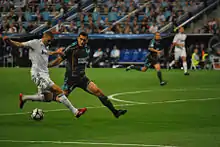 Benzema made his league debut for Madrid on 29 August 2009 against Deportivo La Coruña. He started the match, but was substituted out in the second half as Madrid won 3–2.[73] A month later, he scored his first goal for the club in a 5–0 victory against newly promoted Xerez.[74] After missing the mid-week match against Villarreal, against Tenerife at the weekend, Benzema scored his first double for Madrid in a 3–0 home victory.[75] He made his Champions League debut for the club on 30 September in a group stage tie against Marseille.[76] In the match, Benzema assisted on a Cristiano Ronaldo goal.[77] After failing to score a goal in the month of October, in the team's first match in November against Italian club Milan in the Champions League, Benzema scored the opener to give Madrid a 1–0 lead. His goal was later cancelled out by a Ronaldinho penalty.[78] On 7 November, in the El Derbi madrileño against Atlético Madrid, Benzema assisted on Madrid's second goal, scored by Marcelo. Madrid won the match 3–2.[79]