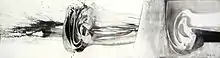 As Götz moved away from clearly defined forms, his approach to painting became more dynamic. In a technique Götz has continued to use throughout his later painting career, the image is developed through a lengthy, intense process, often involving a large number of preliminary sketches and gouaches. Once the preparation is complete, the artist applies dark paint onto a light background with a paintbrush, working in a fast and focused way. The paint is then “raked” - partially removed using a type of spatula known as a “rake” - before the contrast between the light and dark areas of the still-moist surface is softened using a dry paintbrush.[18][19]