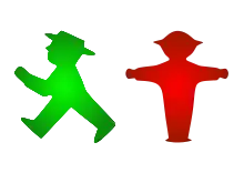 Peglau also designed the Ampelmännchen to be more effective and practical than the previous 1930s-era signals.[4] The green Ampelmännchen's stance resembled an arrow, while the red Ampelmännchen, with his outstretched arms,[3] looks similar to a barricade.[4] The large Ampelmännchen symbols made them easier to see in poor weather.[4]