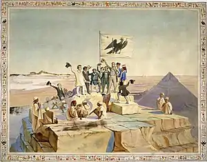 In 1842, Lepsius was commissioned (at the recommendation of the minister of instruction, Johann Eichhorn, and the scientists Alexander von Humboldt and Christian Charles Josias Bunsen) by King Frederich Wilhelm IV of Prussia to lead an expedition to Egypt and the Sudan to explore and record the remains of the ancient Egyptian civilization. The Prussian expedition was modelled after the earlier Napoleonic mission, with surveyors, draftsmen, and other specialists.[4] The mission reached Giza in November 1842 and spent six months making some of the first scientific studies of the pyramids of Giza, Abusir, Saqqara, and Dahshur. They discovered 67 pyramids recorded in the pioneering Lepsius list of pyramids and more than 130 tombs of noblemen in the area.[4] While at the Great Pyramid of Giza, Lepsius inscribed a graffito written in Egyptian hieroglyphs that honours Friedrich Wilhelm IV above the pyramid's original entrance; it is still visible.[5]