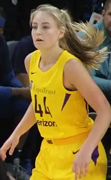 She went undrafted in the 2017 WNBA Draft,[5] and joined the Los Angeles Sparks for the 2017 season and played 3 pre-season games, but a fractured left foot suffered during training camp made the team waive her. Samuelson then joined Pallacanestro Vigarano in Italy's Serie A1 for her first professional season.[6] Samuelson left in January, having played 13 games for Vigarano,[7] alleging personal reasons.[8] Afterwards, she became an assistant coach for the Vanguard Lions, while pursuing a master's degree in Coaching and Athletic Administration from Concordia University Irvine,[9] and also re-signed with the Los Angeles Sparks for the 2018 WNBA season where she made the final roster. Samuelson made her WNBA debut on the 20th of May against the Minnesota Lynx scoring 3 points in 13 minutes of playing time, and ultimately appeared in 20 games of the 2018 season and 2 playoff games, averaging 4.2 minutes per game. While Samuelson left after four games due to the return of starter Jantel Lavender, the Sparks eventually brought her back for the rest of the season in June.[10] Following the Sparks' elimination in the playoffs, Samuelson signed to play in BC Castors Braine of Belgium during the offseason.[11] In Belgium, she averaged 16 points per game in the national league, and 9.7 in the Euroleague. After being waived during the Sparks training camp,[12] Samuelson joined them late in the 2019 WNBA season, following her performance in the EuroBasket Women 2019.[13] In August 2019, she joined the Dallas Wings.[14] Samuelson also signed to play in Spain for Perfumerías Avenida.[15] In 2020, Samuelson was renewed by the Wings, which also signed younger sister Katie Lou Samuelson,[16] but wound up waived before the season begun.[17] Katie and Karlie still wound up playing together for Avenida by the end of the year.[18] Karlie signed again with the Sparks in 2021.[19] After being released in August,[20] she rejoined Katie in the Seattle Storm.[21]