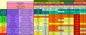 | Dodecad [Globe13] | 67.4% Mediterranean + 16.5% Southwest Asian + 16% North European | 61% Mediterranean + 19.7% Southwest Asian + 19.2% North European |