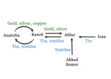 The most important Anatolian export was copper, and the Assyrian merchants sold tin and clothing to Anatolia.[7]