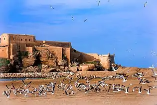 In the 10th century the Umayyads of Cordoba, or their Zenata Berber allies in the region, founded a ribat or fortified monastery/outpost in this area, to defend against the Barghawata Berbers who had established a Kharijite state to the south.[4] This ribat was most likely on the same site as the current Kasbah of the Udayas, but its location has not been confirmed by historians.[4] One of the last Almoravid emirs, Tashfin ibn Ali (ruled 1143-45) built a new ribat on the site of the current kasbah during his efforts to repel the Almohads,[4][5] but the Almohads defeated the Almoravids and destroyed the ribat.[6] In 1150 or 1151 the Almohad caliph Abd al-Mu'min built a new kasbah (citadel) over the site of the former ribat, within which he included a palace and a mosque.[4][6][7] He also had an underground canal dug to divert a water source to the area, allowing for future settlement and urbanization.[5] The later caliph Abu Yusuf Ya'qub al-Mansur (ruled 1184–1199) embarked on a huge project to construct a new fortified imperial capital, called al-Mahdiyya or Ribat al-Fath, on the site of what is now the medina (old city) of Rabat, with new walls extending over a vast area beyond the old kasbah.[5] This project also included the construction of an enormous mosque (the remains of which include the Hassan Tower) and of new grand gateways including Bab er-Rouah, a major gate in the city's western wall, and what is now called Bab Udaya or Bab al-Kbir, the gate of the Kasbah. After Abu Yusuf Ya'qub's death in 1199 the mosque and the capital remained unfinished and his successors lacked the resources or the will to finish it.[5] The kasbah itself became essentially abandoned.[6] Meanwhile, the town of Salé across the river, grew in importance and was developed during the Marinid era.[6][4]