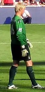 In the first month of the season, Schmeichel was shown a seemingly needless red card in the 79th minute of Leicester's away game to Nottingham Forest on 20 August 2011 after receiving two yellow cards for "unsporting conduct". He received the first card for moving the ball from the penalty spot as Forest's Lewis McGugan was about to take a kick, then received his second for throwing the ball away after the spot kick was successfully converted. After the match, Schmeichel apologized, claiming his back was turned to the referee so did not know he had received the first of the yellow cards. "I didn't know I had been booked as I had my back to the ref otherwise I would never have done that," he said on his personal Twitter page.[56][57] Despite this, Schmeichel's performances for Leicester quickly began earning him plaudits, with his then manager Sven-Göran Eriksson comparing him with England number 1 goalkeeper Joe Hart,[58] and teammate and former England international Paul Konchesky describing him as "one of the best [goalkeepers] he has ever played with".[59] A short-distant reaction save against Portsmouth in November 2011, in particular, earnt Schmeichel praise and was described by Portsmouth manager Michael Appleton as "one of the best saves I have seen in a very long time".[60] and by Leicester manager Nigel Pearson as "a world-class, outstanding save and was very important at that point of the game".[61]