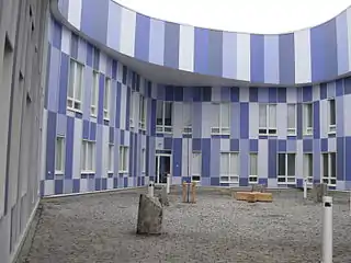 The construction costs of the community centre were around 42 million euros total with a Public-private partnership (PPP) of 25 years with the construction firm Lemminkäinen.[1] The building lies on a seven hectare property and its total area is around 23 000 gross square metres (35 650 071.3 square feet) and floor area measured at 24 588 square metres (264 663.029 square feet).[2] Construction on the community centre began in 2012 and was completed in 2014 when it was handed over for the city's operations and inauguration for the building was held later that year in November. The PPP with the city and the construction firm which includes the maintenance of the building is valid until 2039 and the deals total value is around 86 million euros. The bearing structures of the building are made out of concrete elements and exterior walls from wooden elements with colorful cement bonded fiberboards on top. Parking spaces include 200 parking spots for motor vehicles and 900 bicycle stand spots.